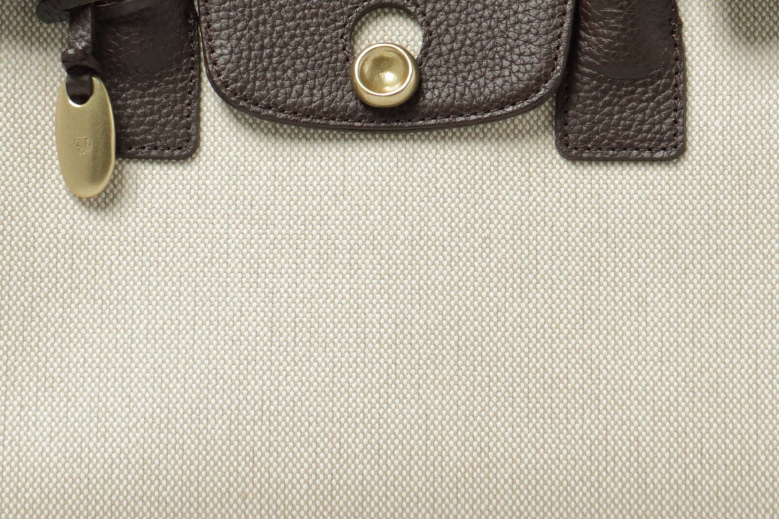 大きく被さる”リーフ”が上品かつ、印象的。このリーフ部、ハンドル部、両サイド、そして底にはシュリンクレザーが使用されています。それ以外の部分にはオリジナルのマテリアル”シャンブレーキャンバス”が使用されています。これは後ほどご説明させていただきます。