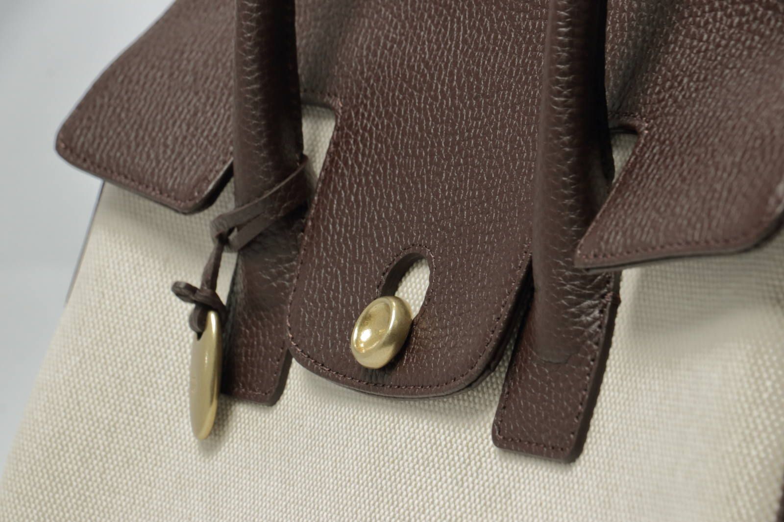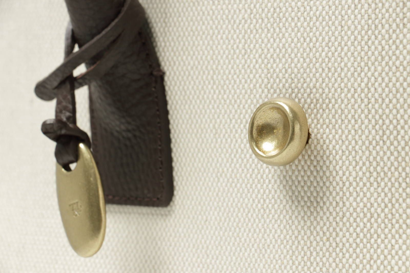 以前もブログにてご説明させていただきましたが、留め具のボタンはオリジナルデザインの真鍮金具。中央のくぼみ部分は、砂型で作る鋳物ならではの磨く前のざらざらとした風合いをあえて残し、陰影を表現しています。
