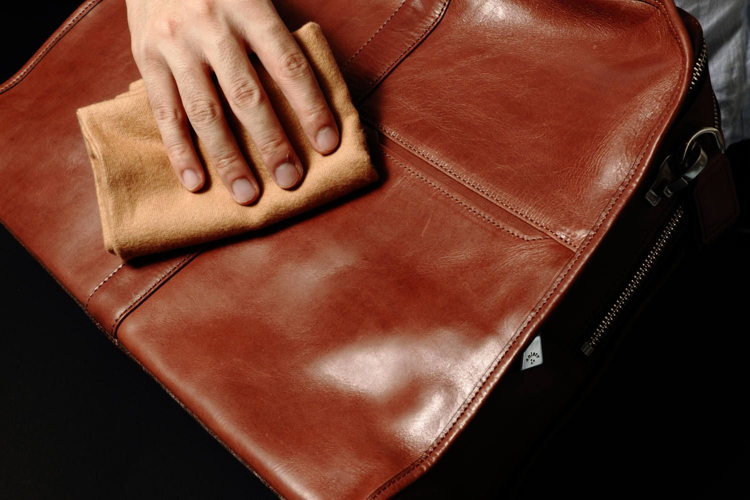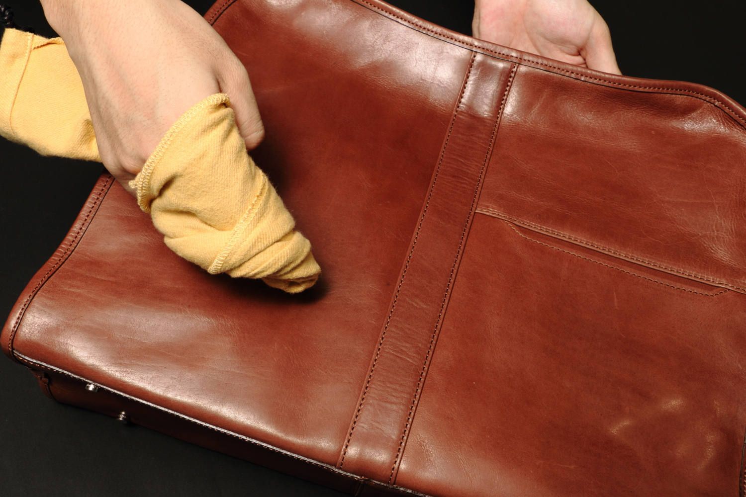 カバンをご使用頂いた時は、綺麗な乾いた布で革表面の汚れやホコリを落とします。質のいいレザーは布で磨くだけで、内部のオイルやワックスが浮き出てツヤが出てきます。