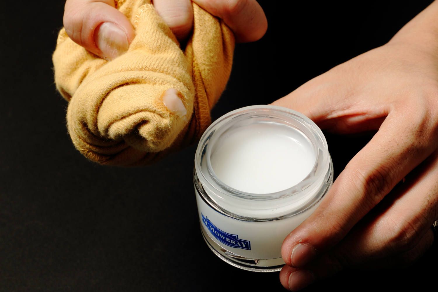 塗り込んだクリームがしっかりと乾いたら仕上げにクリームを乾いた布で乾拭きし余計なクリームを取り除きます。シワ部分や縫い目などはクリームが残り易いので気をつけて下さい。この時、用意する布は仕上げように用意する事をお勧めします。