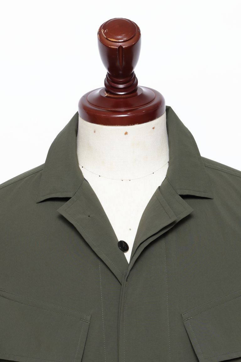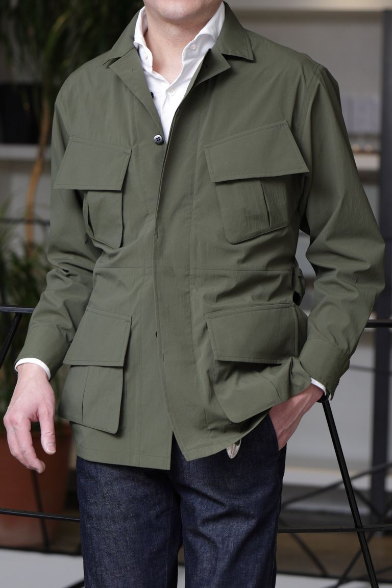 両肩のエポーレットは排除し、前身頃に配した4つのフラップパッチポケットの立体的なデザインを生み出しています。フラップは内側にボタンを配した比翼仕立の二重構造で、ボタンを留めてもすっきりとした見た目を保ちます。ポケットはしっかりとマチがとられ、少し斜めに配置された胸ポケットなど本格的なディテールも目を引きます。ウエストベルトは気分次第でアレンジが可能。ミリタリージャケットながら、ビジネスカジュアルなどデイリーにも羽織れる品の良さが漂う一着に仕上がっています。